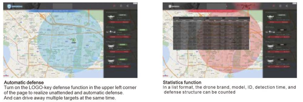 Para drones invasores, você pode escolher: Uma-chave de defesa automática: depois que a função de defesa do sistema for ativada, o drone de invasão será automaticamente defendido pelo sistema sem pessoal de plantão; Intervenção manual: Você pode optar manualmente por defender qualquer drone, e como Time de defesa, ou interromper a defesa, e pode optar por localizar o piloto.